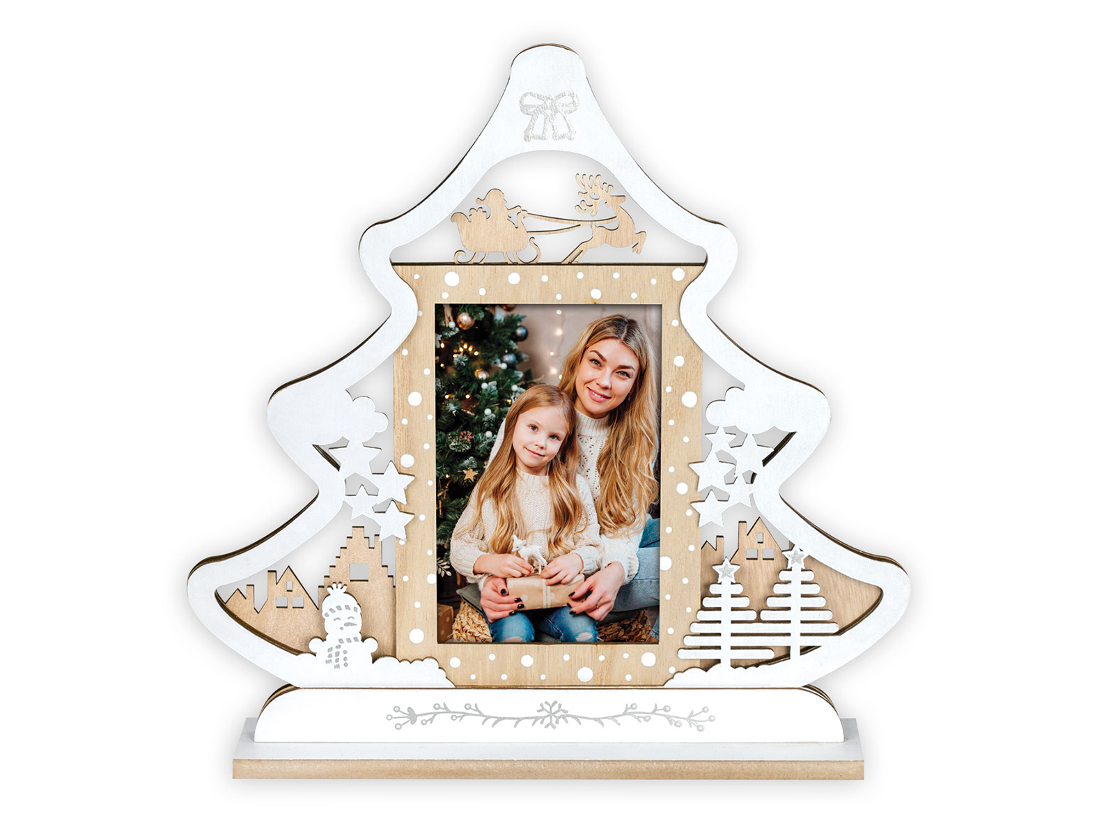 Karácsonyfa alakú, fából készült képkeret Dombornyomott díszítéssel Kép mérete: 10*15 Asztalra állítható kivitel