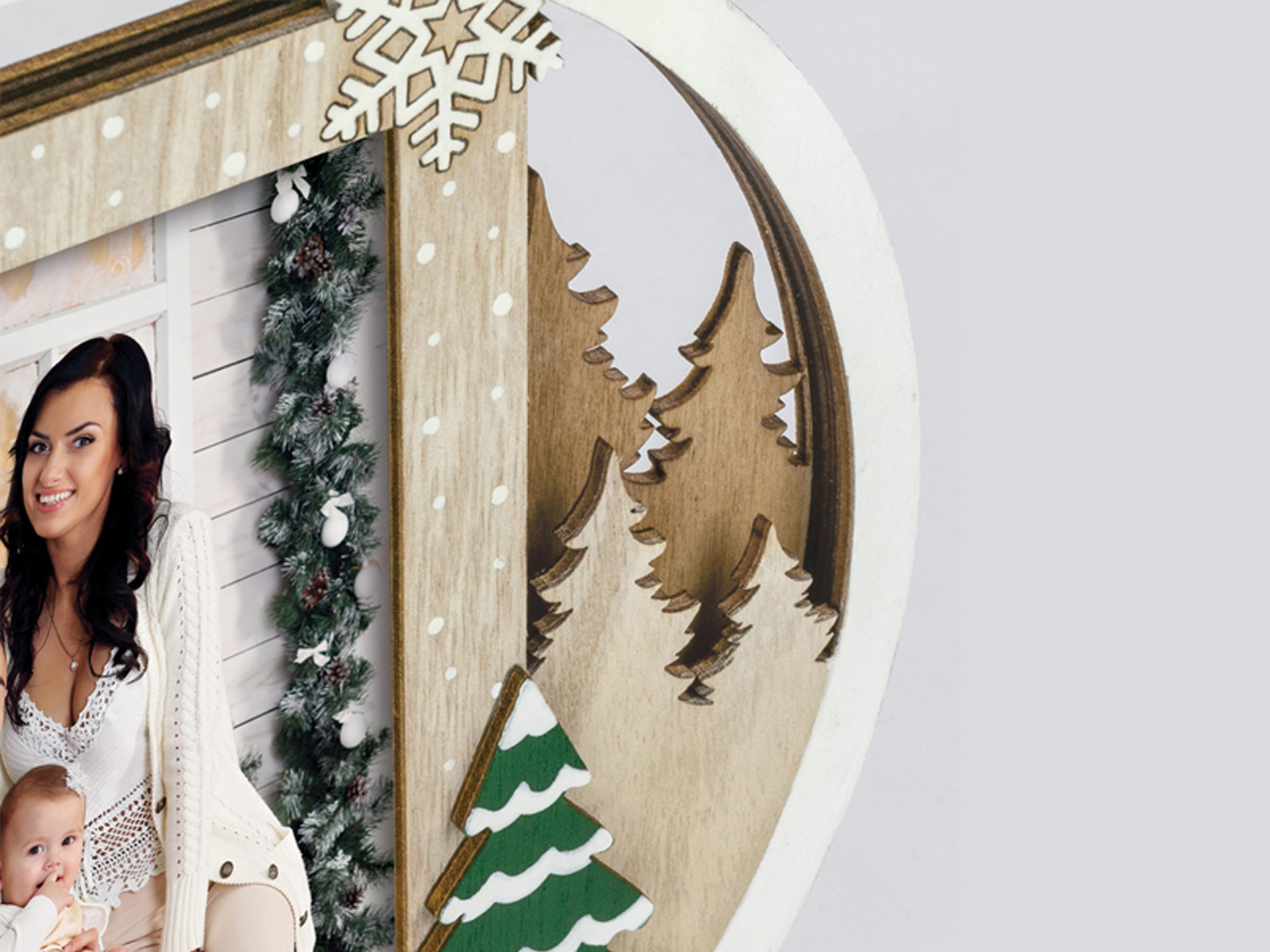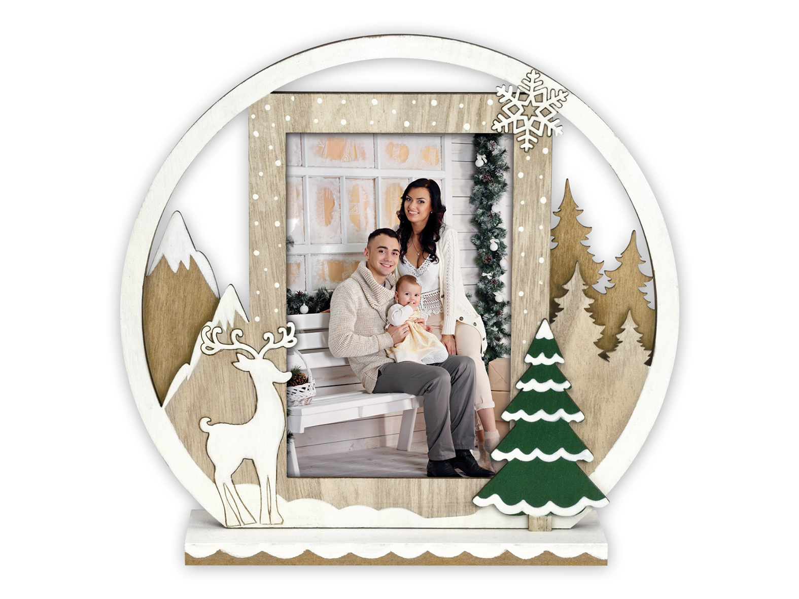 Karácsonyfa alakú, fából készült képkeret Dombornyomott díszítéssel Mérete: 23*21*5 cm Képméret: 10*15 Asztalra állítható kivitel