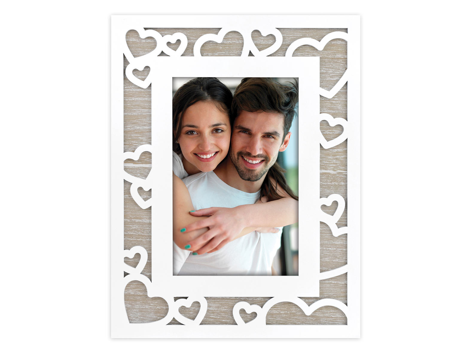 Fa keret, dombornyomott szív alakú díszítéssel Képméret: 10*15 cm Kitámasztható kivitel Tájolása: függőleges
